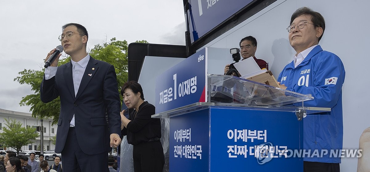 (익산=연합뉴스) 황광모 기자 = 무소속 김상욱 의원이 16일 전북 익산시 익산역 동부광장에서 열린 더불어민주당 이재명 대선후보 유세에 참가해 연설하고 있다. 2025.5.16 hkmpooh@yna.co.kr