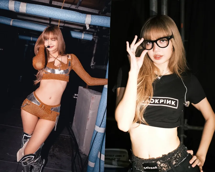 또 다른 컷에서는 브라운 크롭탑과 핫팬츠, 그리고 브랜드 로고 티셔츠를 착용해 시크하면서도 유쾌한 무드로 반전 매력을 선보였다. 긴 웨이브 헤어와 고글 스타일의 블랙 안경은 무대 밖에서도 ‘리사 스타일’의 개성을 완벽히 드러낸다.