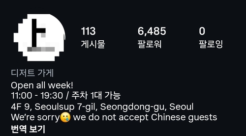 하지만 카페의 인스타그램 공식 프로필에는 "미안하지만 우리는 중국인 손님을 받지 않는다"는 영어 문구가 그대로 있는 상황이다.