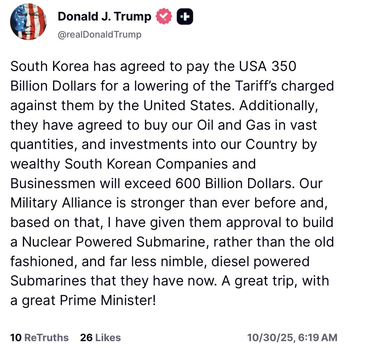 트럼프 대통령은 이날 새벽 전날 열린 한미 정상회담 결과를 설명하고 게시글 마지막 부분에 "훌륭한 국무총리(a great Prime Minister)와 함께한 훌륭한 방문!"이라고 썼다.