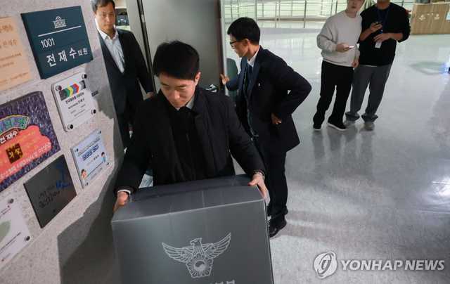 (서울=연합뉴스) 신현우 기자 = 15일 국회의원회관 내 전재수 전 해양수산부 장관 사무실에서 통일교 금품 수수 의혹과 관련해 압수수색을 마친 경찰 관계자들이 나오고 있다. 2025.12.15 nowwego@yna.co.kr
