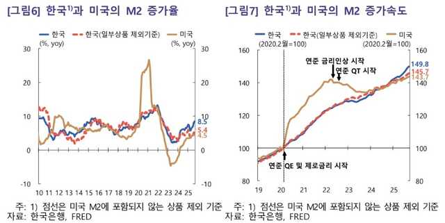 코로나19 팬데믹 직전인 2020년 3월로 시야를 넓혀보면, 한국과 미국의 M2 누적 증가율이 49.8%, 43.7%로 큰 차이가 나지 않는다는 게 한은 설명이다.