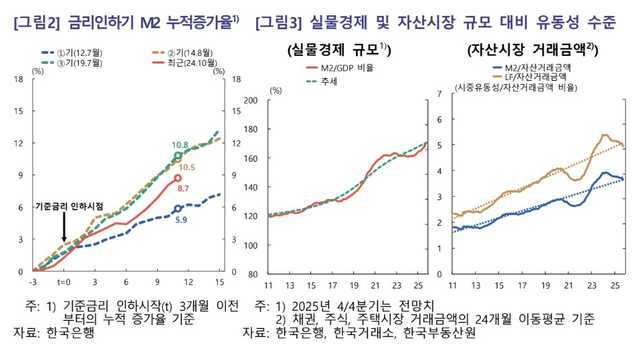 과거 금리 인하기와 비교하면, 이번 인하기의 M2 누적 증가율은 8.7%로 2012년(5.9%)보다 높지만, 2014년(10.5%)이나 2019년(10.8%)보다는 낮다는 것이다.