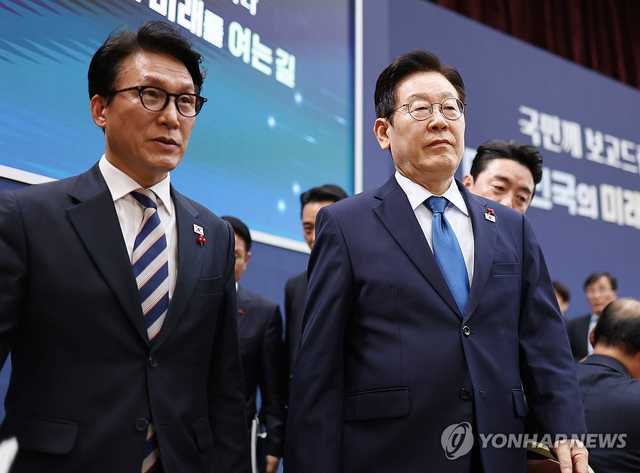 (세종=연합뉴스) 김도훈 기자 = 이재명 대통령이 17일 정부세종컨벤션센터에서 행정안전부(경찰청, 소방청)·인사혁신처 업무보고를 마친 후 이동하고 있다. 왼쪽은 김민석 국무총리. 2025.12.17 superdoo82@yna.co.kr